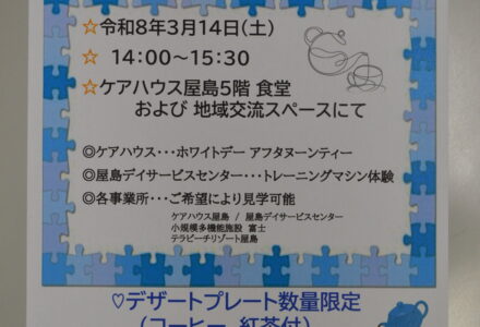 2026.03.5 各施設予約状況 2026.03.5 3/14イベントお申し込み可能です 2026.03.5 ひな祭り🎎 2026.03.2 屋島防災フェスタin屋島西小学校 2026.02.25 小規模手工芸 2026.02.18 3/14イベントを開催します 2026.02.15 Valentine’s Day 2026.02.8 高松も雪が降りました 2026.02.4 各施設予約状況 2026.02.4 節分会 豆まき・餅つき大会 お知らせ スタッフブログ ケアハウス屋島 屋島デイサービスセンター 小規模多機能施設 富士 テラビーチリゾート屋島 2026年3月 2026年2月 2026年1月 2025年12月 2025年11月 2025年10月 2025年9月 2025年8月 2025年7月 2025年6月 2025年5月 2025年4月 2025年3月 2025年2月 2025年1月 2024年12月 2024年11月 2024年10月 2024年9月 2024年8月 2024年7月 2024年6月 2024年5月 2024年4月 2024年3月 2024年2月 2024年1月 2023年12月 2023年11月 2023年10月 12345...10...»最後 »